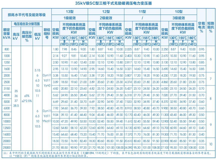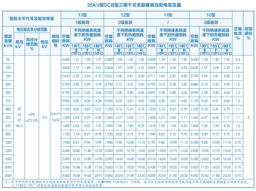 SCB系列35kV干式变压器产品技术参数表